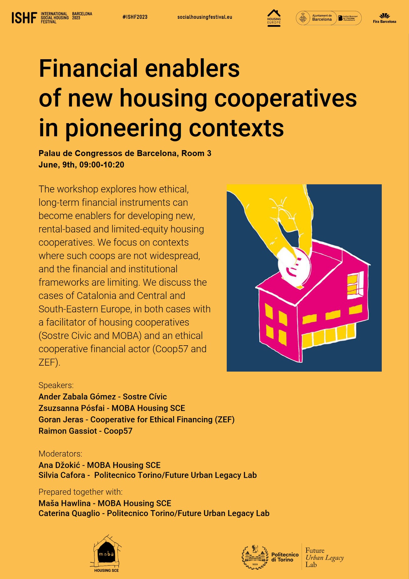 The workshop explores how ethical, long-term financial instruments can become enablers for developing new, rental-based and limited-equity housing cooperatives. We focus on contexts where such coops are not widespread, and the financial and institutional frameworks are limiting. We discuss the cases of Catalonia and Central and South-Eastern Europe, in both cases with a facilitator of housing cooperatives (Sostre Civic and MOBA) and an ethical cooperative financial actor (Coop57 and ZEF).