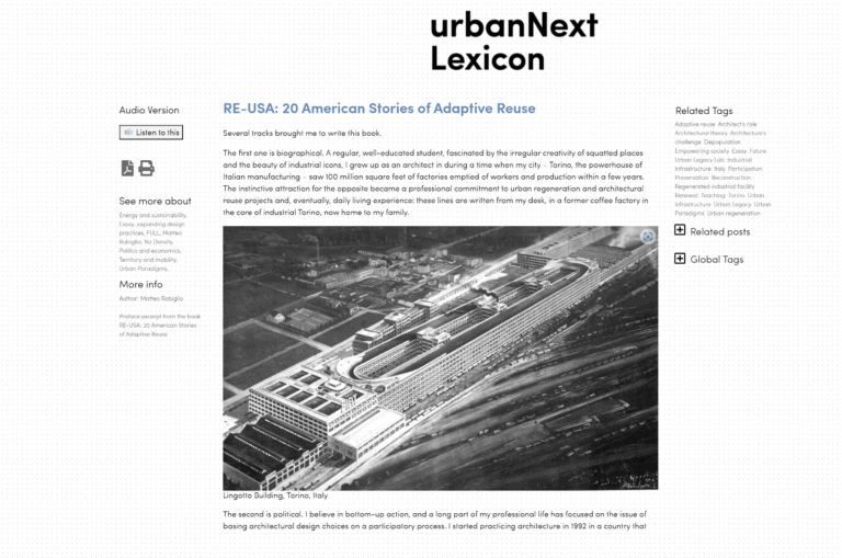 3 febbraio 2018 – l’introduzione dell’ex direttore di FULL al suo libro RE-USA. “People took back city-making more when they acted directly to reshape places – with the support of professionals, when needed – rather than when they expressed their opinion in deliberative processes. And those places happened to be mostly reused spaces: where the legacy of the past – often industrial – provided the infrastructure for social, political, and economic innovation.”